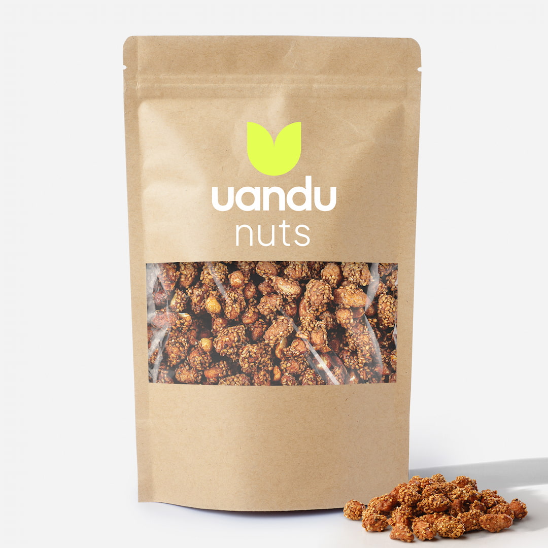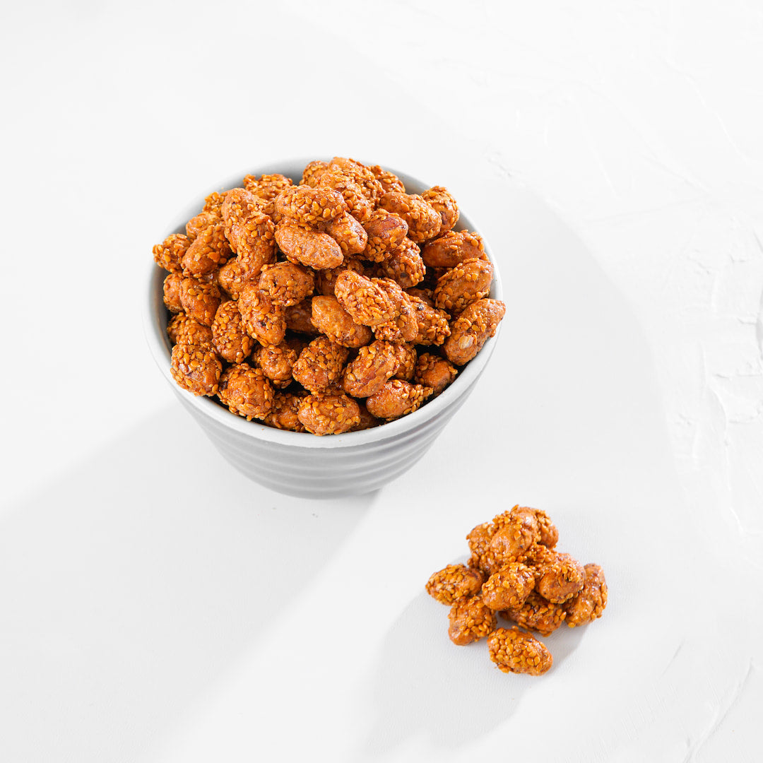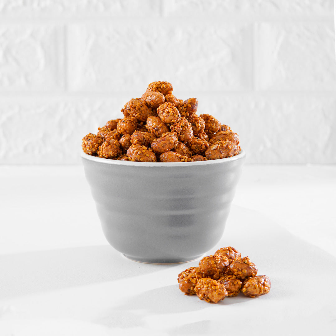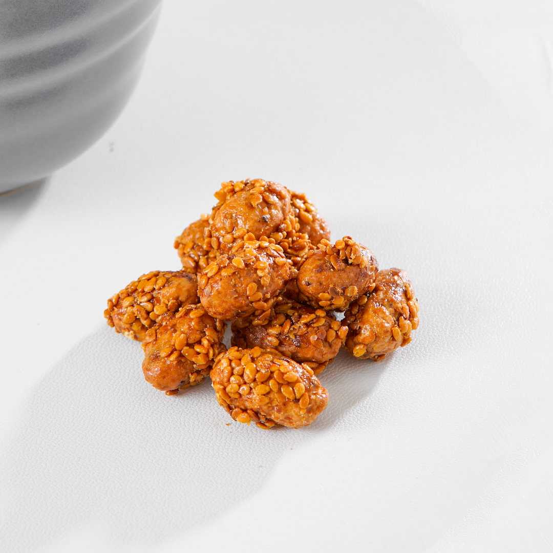 Beschreibung: Erdnüsse in Sesam sind ein delikater Snack, der die natürliche Cremigkeit der Erdnüsse mit dem nussigen Aroma von Sesamkörnern vereint. Diese köstlichen Nüsse sind sorgfältig mit geröstetem Sesam überzogen, was ihnen eine knusprige Textur und einen unverwechselbaren Geschmack verleiht. Der Sesam verleiht den Erdnüssen eine leicht süße und herzhafte Note, die perfekt mit der natürlichen Nussigkeit der Erdnüsse harmoniert. Genießen Sie sie als gesunden Snack oder als Beilage zu verschiedenen Gerichten – Erdnüsse in Sesam sind ein wahrer Gaumenschmaus!