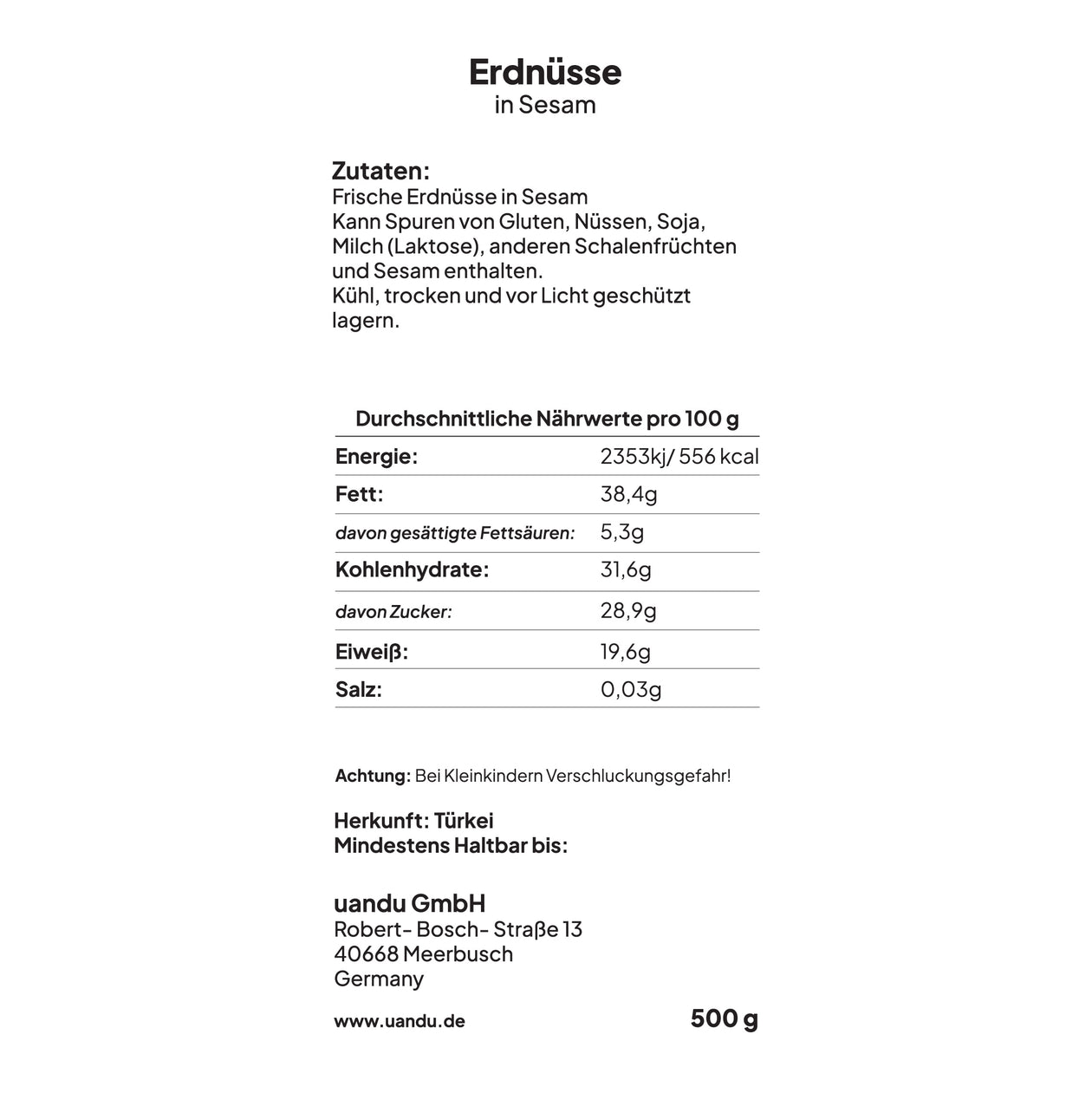 Inhalt: Erdnüsse, Sesam, Zucker, Vanille.