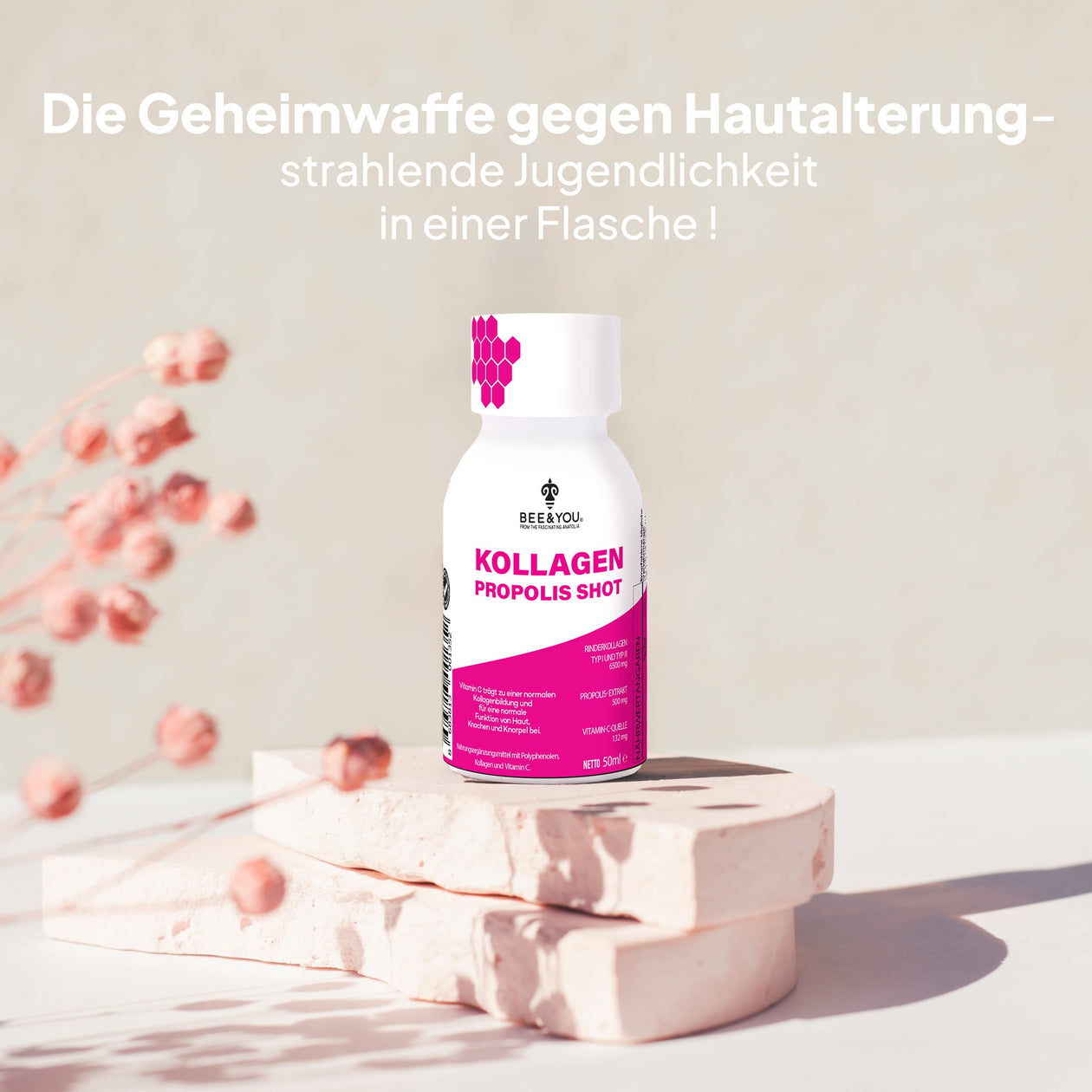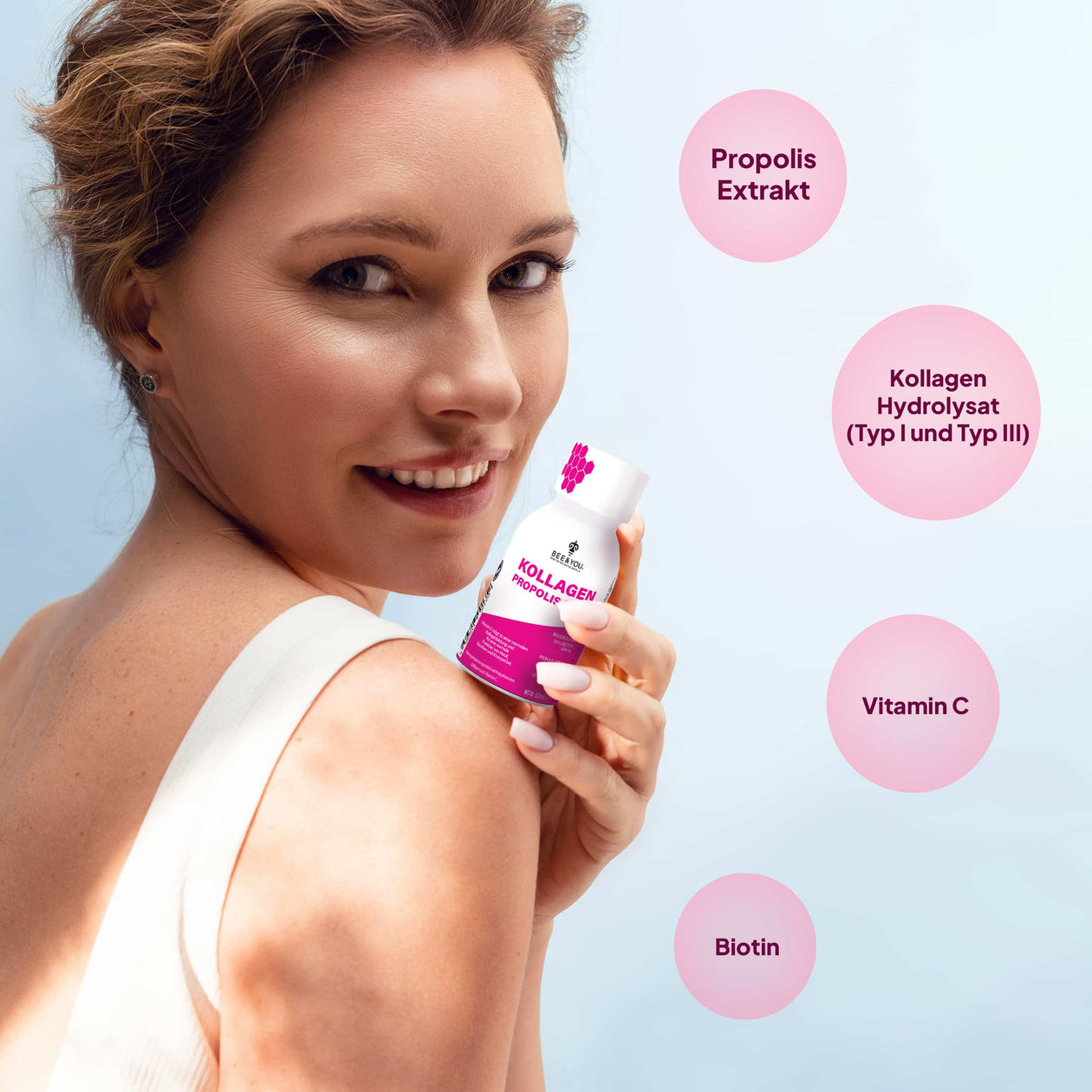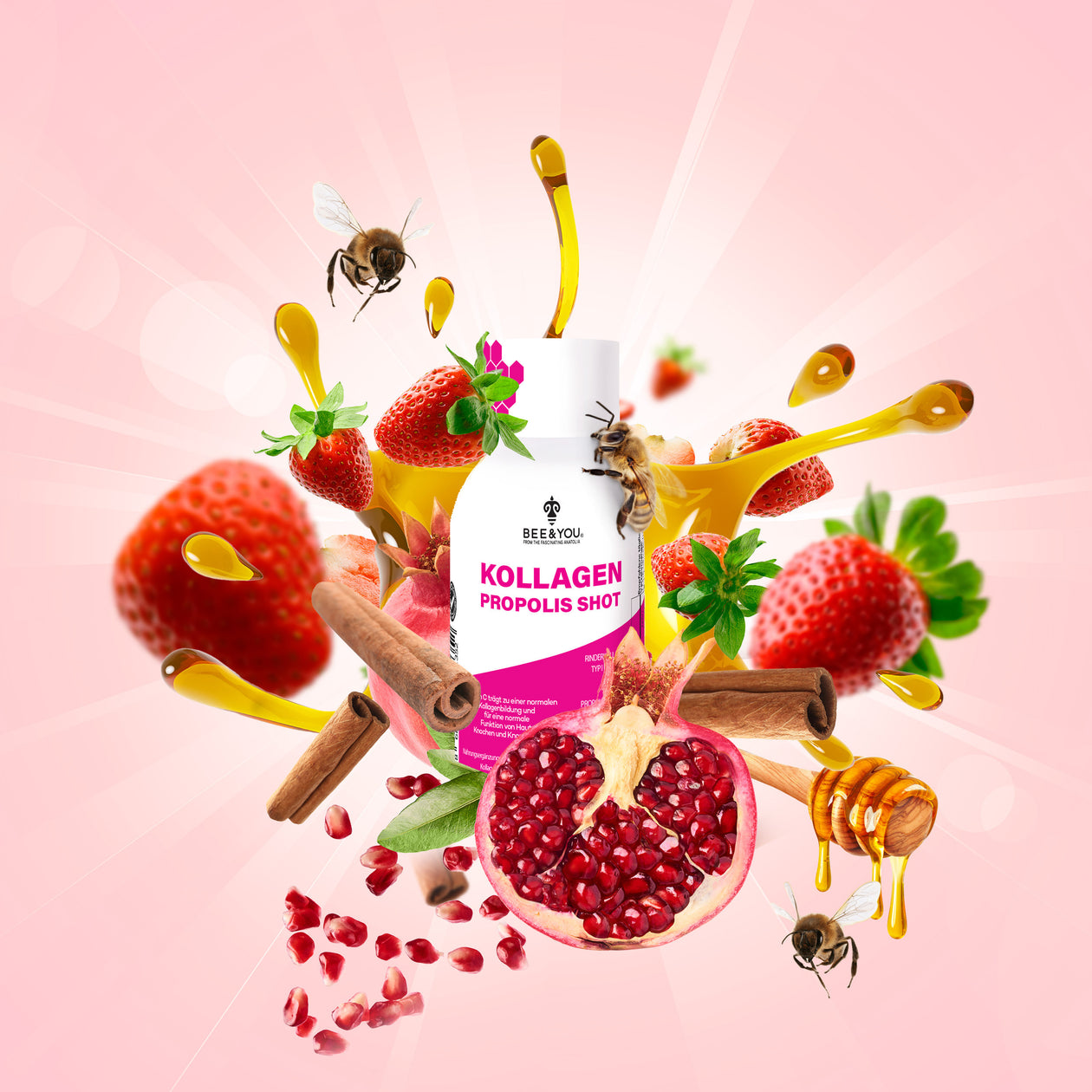 Kollagen Shot mit Propolis und Vitamin C. Das beste Kollagen zum trinken mit Kollagen-Hydrolysat (Typ I und Typ III) enthält zusätzlich Vitamin C. Vitamin C trägt zu einer normalen Kollagenbildung und für eine normale Funktion von Haut, Knochen und Knorpel bei.